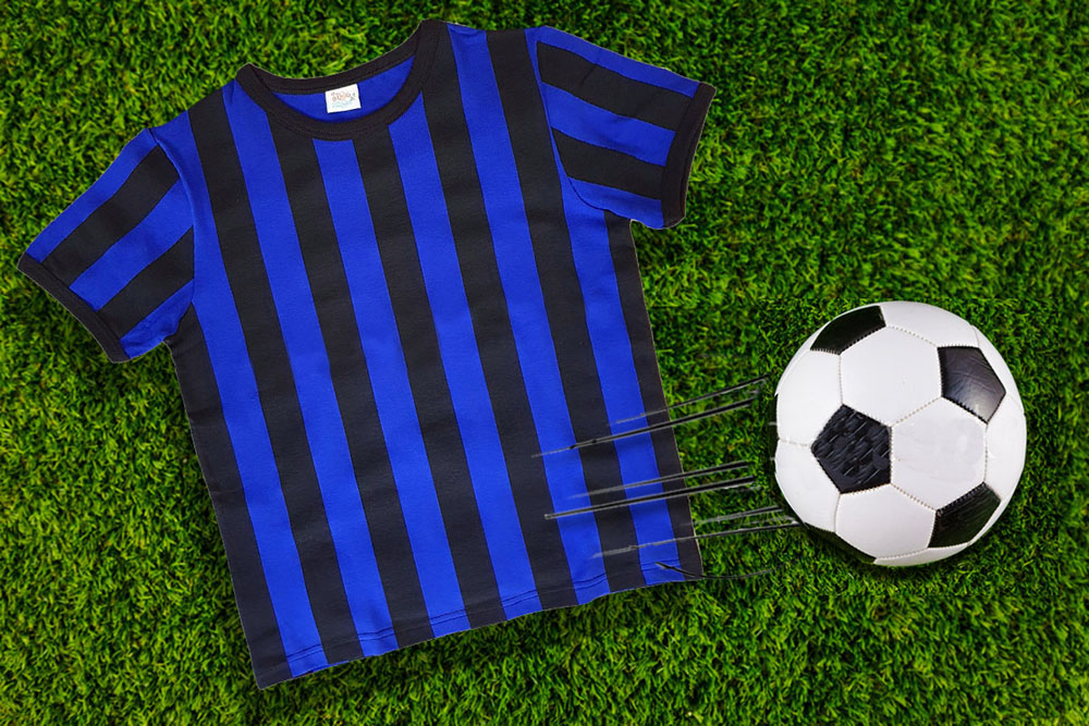 Handgefertigtes kurzärmeliges Fußball-T-Shirt in blau-schwarzen Streifen