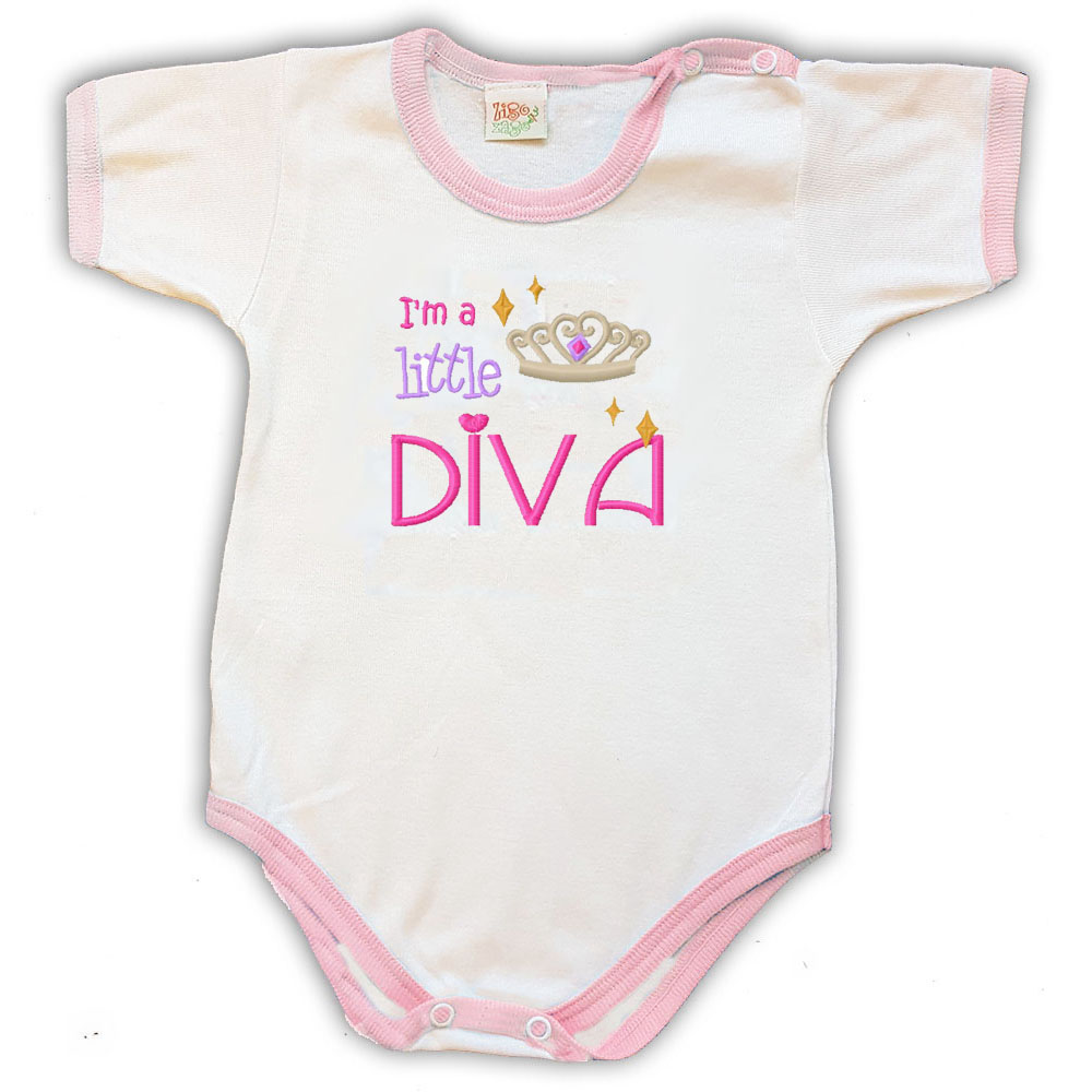 Body Made in Italy a Manica Corta Fatto a Mano in Cotone ricamato con la scritta “I’m a little diva” in inglese